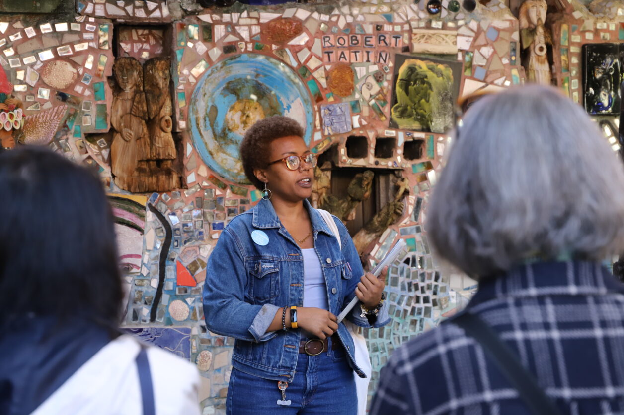 Slow Art Day is an internationally-observed day where folks are encouraged to slow down and spend more time observing art. At Philadelphia’s Magic Gardens (PMG) we invite you to take a moment and absorb in all the details of our space! Enter PMG between 1:30 – 2:30 p.m. on Saturday, April 13, and take 5-10 minutes to view a pre-selected section of the mosaics. At 2:30 p.m. join a museum educator for an in-depth discussion on that section. To celebrate the 20-year-anniversary of our nonprofit organization our talk will include how the text written on the tiles tells the story of how the Magic Gardens was created, as well as chronicles the lives of PMG-founder Isaiah Zagar and his wife, Julia.